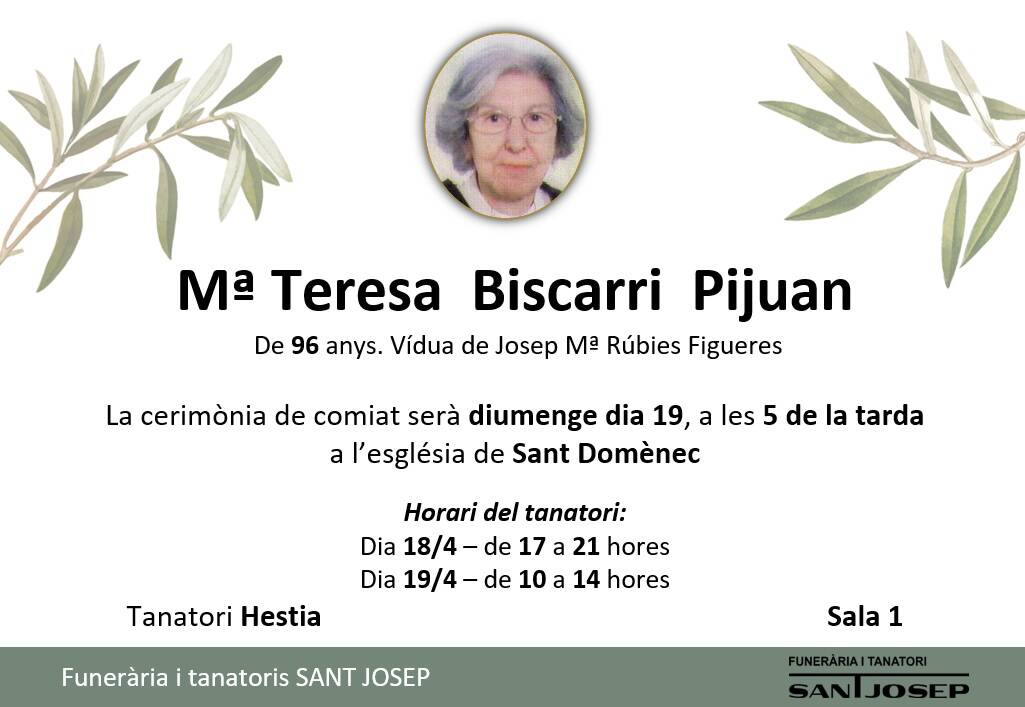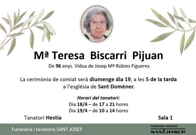 De 96 anys. Vídua de Josep Mª Rúbies Figueres